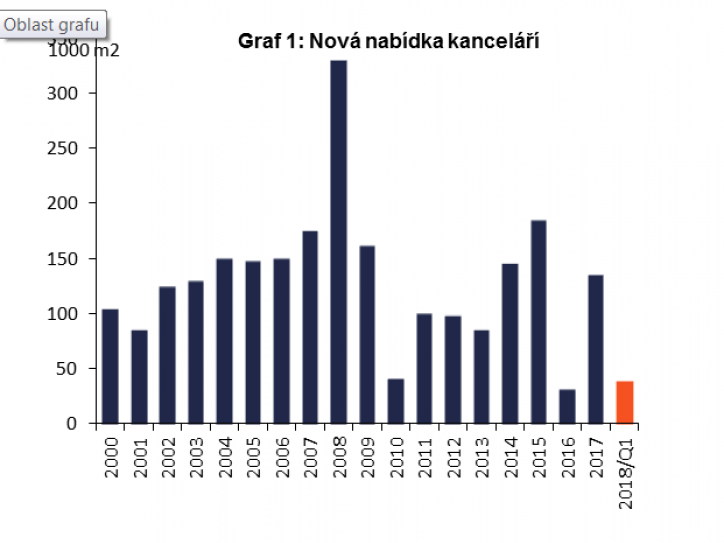 Kancelářská poptávka nebyla v prvním čtvrtletí tak výrazná jako v předchozím čtvrtletí, mezičtvrtletně poklesla o 52 %. Ve srovnání s 2017 Q1 došlo taktéž k propadu a to o 4 %. Celková hrubá poptávka v Praze dosáhla v 2018 Q1 přibližně 81 000 m2.