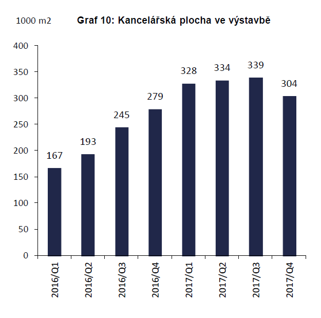 V 2017 Q4 se v hlavním městě nacházelo více než 304 000 m2 rozestavěných kancelářských ploch. Stavební práce byly zahájeny například na novém kancelářském projektu Churchill I., který se nachází v Praze 3. I ve čtvrtém čtvrtletí 2017 zůstala budova ČSOB Bank II největším rozestavěným projektem v Praze.