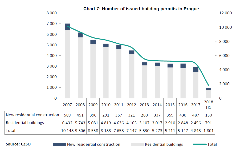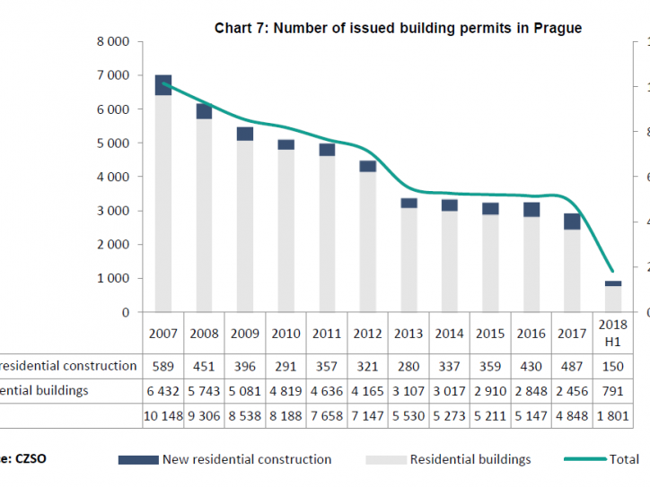 V hlavním městě se v první polovině roku 2018 vydalo pouze 1 801 stavebních povolení, ve srovnání s první polovinou roku 2017 (2,462) došlo k propadu. Průměrně bylo v uplynulých pěti letech v hlavním městě každoročně nově dokončeno 5 144 bytů. V první polovině roku 2018 pokračoval růst nabídkových cen bytů ve všech třech sledovaných oblastech.